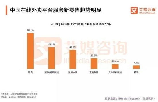 新零售成為在線外賣平臺服務(wù)新趨勢:第三季度調(diào)查中,80.1%的用戶偏好使用在線外賣平臺的外賣服務(wù);48.1%的用戶偏好使用在線外賣平臺的超市、網(wǎng)購配送服務(wù);42.0%的用戶品偏好使用在線外賣平臺的生鮮水果服務(wù);