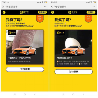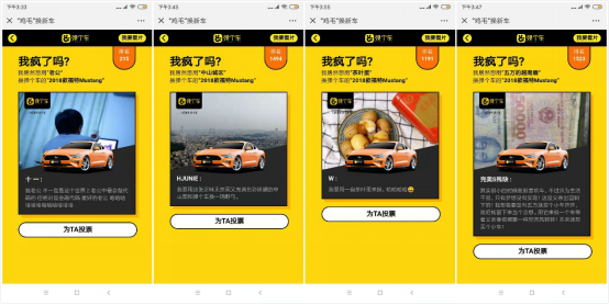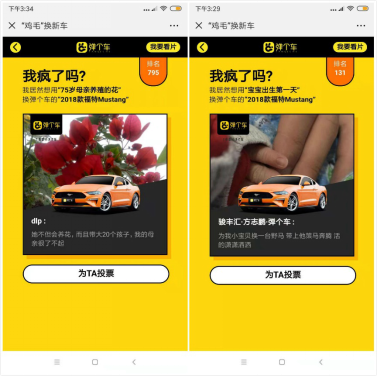 如果在你面前,有一個用“雞毛”換新車的機(jī)會,你會拿什么來換?前幾天,彈個車就推出了一個“雞毛換新車”的創(chuàng)意互動活動,消費(fèi)者用“雞毛”等小物件就能換取福特Mustang新車1年免費(fèi)使用權(quán)?;顒右唤?jīng)推出,就吸引了數(shù)千人參加,大家紛紛上傳各種稀奇古怪的小物件,用來換取新車。