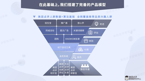 美團(tuán)點(diǎn)評線上線下一體化營銷產(chǎn)品矩陣覆蓋了用戶消費(fèi)全周期和決策歷程的各個(gè)關(guān)鍵節(jié)點(diǎn),幫助品牌完成從獲取用戶認(rèn)知到消費(fèi)轉(zhuǎn)化營銷全流程,讓營銷從被動變主動。在用戶考慮階段,有“招生寶”、“放心學(xué)”等產(chǎn)品滿足品牌訴求,待用戶評估產(chǎn)品時(shí),“同城活動”、“圖文廣告”、“關(guān)鍵詞搜索”等產(chǎn)品提供了豐富的選擇,直至用戶成長為裂變用戶,又可通過“砍價(jià)寶”、“大眾點(diǎn)評頭條”等工具幫助品牌廣泛傳播其價(jià)值。