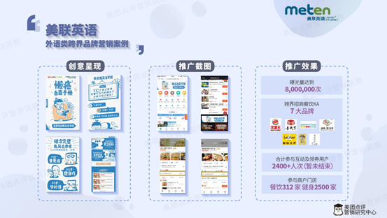 基于用戶分析,平臺為美聯(lián)量身定制了營銷方案,一是場景營銷,在餐廳、運(yùn)動場所等用戶經(jīng)常瀏覽頁面增加品牌推送,以方便用戶與品牌達(dá)成鏈接。二是在消費(fèi)的各個(gè)階段精準(zhǔn)推薦品牌,譬如通過“推廣通”、“團(tuán)購”、“閃惠”等工具頁面精準(zhǔn)觸達(dá)潛在用戶,以強(qiáng)化用戶對品牌的認(rèn)知。整套方案跨界合作了7大品牌,312家餐廳點(diǎn),2500家健身機(jī)構(gòu)參與聯(lián)動,品牌曝光量高達(dá)800萬,完美達(dá)成客戶提升品牌曝光度和認(rèn)知度的需求。