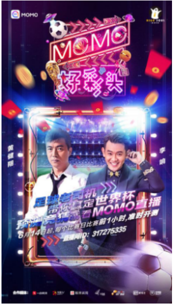 《MOMO好彩頭》作為一場融入積分體系和競猜元素的活動, 營造了濃厚的世界杯場景氛圍, 邀請知名足球評論員黃健翔和主持人李響坐鎮(zhèn),集結(jié)了以韓喬生、劉語熙、楊璞、陸慧明為首的央視名嘴、退役國腳、足彩分析師等,借助直播的形式展開預(yù)言比拼的深度互動。