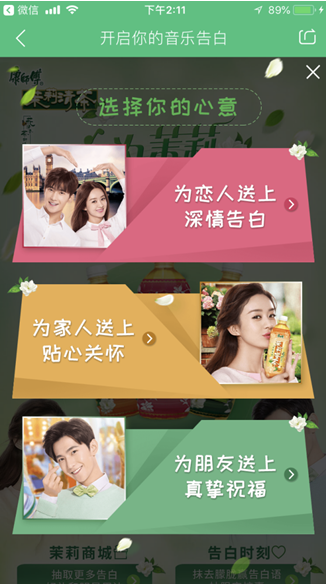 緊抓每一個(gè)與消費(fèi)者溝通的重要契機(jī),康師傅茉莉從“音為茉莉,真情告白”貫穿全線?!?13茉莉全民告白日”、母親節(jié)、“520表白日”等多個(gè)時(shí)間節(jié)點(diǎn),打造了全方位的告白場景,為消費(fèi)者解鎖了一個(gè)全新的告白打開方式。愛是件很簡單的事,但說愛你確是一件有口難開的事。無論是對父母的養(yǎng)育之恩、愛人的陪伴余生,還是朋友的相輔相成,我們都不善于去表達(dá)愛~但還好,這一路上,有康師傅茉莉?yàn)槟愦舐曊f出愛。