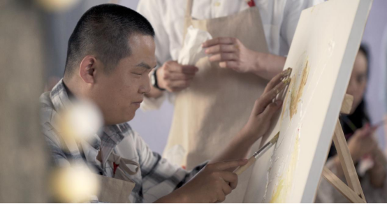如此精美的作品,這些視障畫家是怎么完成的呢?現(xiàn)場很多人抱著這樣的震驚和疑問。通過盲胞繪畫紀錄片,他們看到了這些“特殊畫家”的創(chuàng)作過程。原來,他們的繪畫方式與視障人士閱讀的方式相同,通過觸摸畫布和顏料的紋理作畫,從大致的輪廓到每個小細節(jié)都需要憑借超長的耐心去“觸摸”完成。