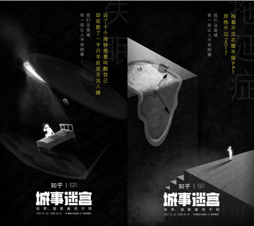2017年 12月22日起,知乎聯(lián)合北京朝陽大悅城悅界空間,用一場主題為“城事迷宮”的跨年展,直擊孤獨、中年危機(jī)等人群的不安內(nèi)心。伴隨著17種和不安有關(guān)的創(chuàng)意展品一同呈現(xiàn)的,還有知乎用戶為“不安”寫下的答案。