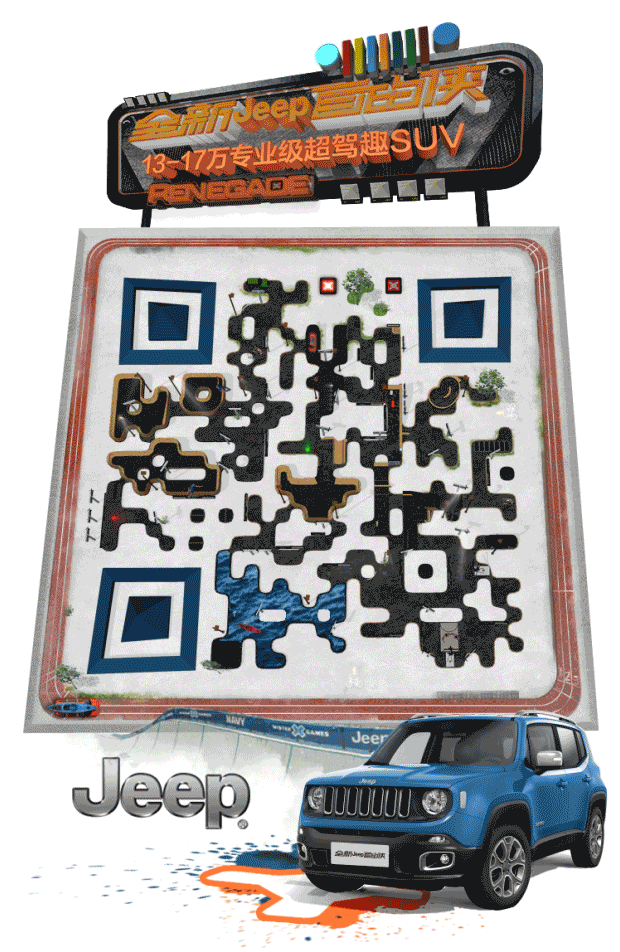 無探索,不創(chuàng)意。首先打破一碼到底的常規(guī),為每一款車型專屬定制。如用極限主題公園定義主打駕趣的Jeep自由俠,以街球、滑板、摩托艇等元素豐富畫面,并使用三維建模技術(shù)與二維碼的特殊圖形融為一體,使整個碼有如微觀世界一般生動,而不只是生硬的在碼上添加素材。