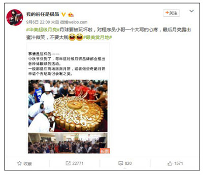 ??當(dāng)然,把活動(dòng)推向高潮的是知名KOL段子手“我的前任是極品”。她用長(zhǎng)圖文段子塑造了苦逼程序員、充滿(mǎn)人格的月球的形象,瞬間引發(fā)超萬(wàn)的轉(zhuǎn)發(fā),同時(shí)多名段子手對(duì)微博進(jìn)行轉(zhuǎn)載,再一次刷了社交媒體的屏,引起了新一輪曝光和社交討論,完美將華美月餅和超級(jí)月亮再次結(jié)合。