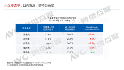 ??【變化3-品類滲透加速】2019年6月,音樂、游戲、生活、教育四大品類的月活滲透率均呈現(xiàn)增長態(tài)勢。2019年6月對比去年年底,音樂類上升近3個百分點,以50.4%的月活滲透率位居垂直類榜首,第二位是游戲類,半年增長5個百分點,月活滲透率上升至26.1%。生活類月活滲透率增長最明顯,達(dá)到7個百分點。