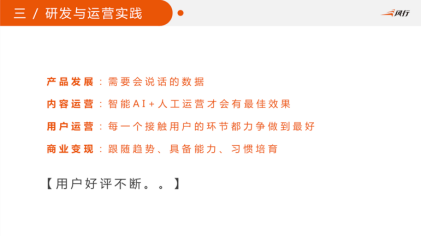 ??風(fēng)行代表副總裁黨永在先生就“大屏短視頻業(yè)務(wù)的思考與實踐” 話題,將橙子短視頻的經(jīng)驗進(jìn)行了分享。認(rèn)為大屏商業(yè)化既離不開好的平臺,也離不開規(guī)模。如何通過好的產(chǎn)品或平臺將用戶吸引回大屏,是行業(yè)需要共同努力解決的問題?;诙桃曨l逐漸泛化的發(fā)展趨勢,以及大屏互聯(lián)網(wǎng)化、用戶趨向互聯(lián)網(wǎng)化,風(fēng)行推出了橙子短視頻應(yīng)用,以期能為大屏吸引回用戶帶來新的力量。風(fēng)行在短視頻業(yè)務(wù)運營中,著重打磨產(chǎn)品,通過為用戶提供豐富優(yōu)質(zhì)的內(nèi)容、便捷流暢的用戶體驗和新技術(shù),為用戶帶來優(yōu)質(zhì)體驗。同時,通過高質(zhì)量的數(shù)據(jù)驅(qū)動,指導(dǎo)產(chǎn)品設(shè)計與優(yōu)化、推薦優(yōu)化等;通過智能AI+人工運營,實現(xiàn)最佳內(nèi)容運營效果;在接觸用戶的每一個環(huán)節(jié)都力爭做到最好,從而吸引用戶回歸、留駐大屏。
