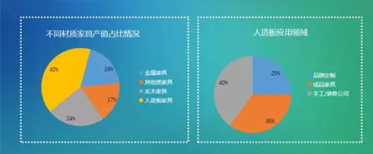 在家具總產(chǎn)值中,木家具的比例為64%,其中,人造板家具占40%,實(shí)木家具24%。金屬家具和其他類家具分別占19%、17%。在人造板應(yīng)用領(lǐng)域當(dāng)中,品牌定制占25%,成品家具占35%,手工/裝修公司占40%。