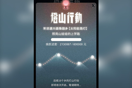 首款微信公益小游戲《燈山行動》3日內(nèi)打動128.5萬體驗(yàn)用戶,募捐金額超200萬,將幫助多個偏遠(yuǎn)山村修建路燈