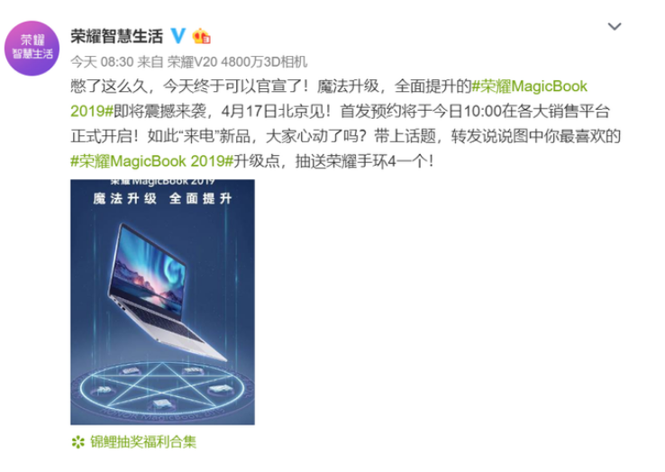 榮耀的Magicbook在2018年堪稱是筆記本行業(yè)的“價(jià)格殺手”,銳龍版本以超強(qiáng)的性能配置+實(shí)惠的售價(jià)而受到許多用戶的贊許,之前就曾有消息稱Magicbook將會(huì)在近期迎來更新,而今天,微博@榮耀智慧生活正式宣布,將于4月17日在北京舉辦新品發(fā)布會(huì),發(fā)布全面升級(jí)的榮耀MagicBook 2019。