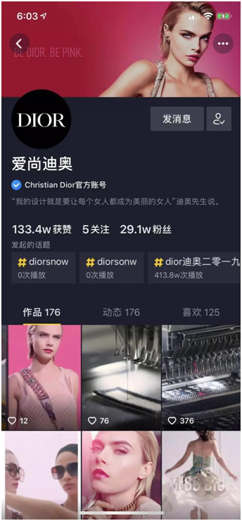 迪奧是最早與抖音合作的奢侈大牌,早在2018年3月份,抖音內(nèi)測(cè)藍(lán)V賬號(hào)時(shí),迪奧就成為4個(gè)參與內(nèi)測(cè)的品牌之一,一直在進(jìn)行藍(lán)V的精細(xì)化運(yùn)營(yíng)。