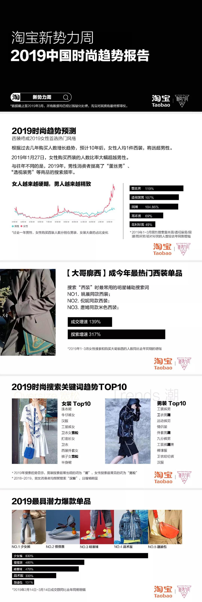 在具有“互聯(lián)網(wǎng)時尚周”之稱的新勢力周期間,淘寶發(fā)布了《2019中國時尚趨勢報告》。據(jù)淘寶平臺成交趨勢顯示,西裝將成為今年女性消費者首選熱門風格,其中,廓形寬肩西裝“大哥廓西”有望成為爆款單品。而大家眼中常常不修邊幅的男性消費者則越來越偏愛國潮設計。報告預測未來10年時尚流行趨勢:女人越來越硬朗,男人越來越精致。
