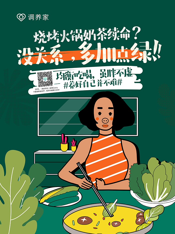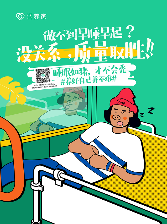 調(diào)養(yǎng)家一直以來倡導(dǎo)的“健康玩出來”理念,與年輕白領(lǐng)群體“邊造邊養(yǎng)”的心理很契合,此次傳播,調(diào)養(yǎng)家把溝通對象聚焦在北上廣一線城市白領(lǐng)群體,從飲食、運(yùn)動、起居、情志四個維度出發(fā),結(jié)合他們生活日常場景,推出了趣味的預(yù)熱海報,并在北上廣寫字樓進(jìn)行投放,個性十足的畫面設(shè)計,搭配有趣扎心的文案,直擊年輕人對健康的渴望與糾結(jié)心理。