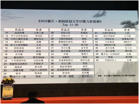 連續(xù)兩年發(fā)布的《2018貓片胡潤原創(chuàng)文學IP潛力價值榜》榜單是由包括起點中文網、塔讀文學網、縱橫中文網、17K小說網等業(yè)內領先的原創(chuàng)文學網站評選出各自最有潛力的三部作品,再由胡潤研究院和貓片根據作者知名度和作品是否適合轉化進行綜合考量后排列出結果。該榜單囊括了各大文學網站半年內提升最快的作品,也被認為是最具IP孵化價值的新作。其中,塔讀文學簽約作者六界三道原創(chuàng)玄幻小說《仙武帝尊》位于榜單第11位,作者不是蚊子原創(chuàng)小說《我被?;嫱坪蟆肺痪影駟蔚?1位,作者辰小白原創(chuàng)作品《凌天至尊》位居榜單第46位。