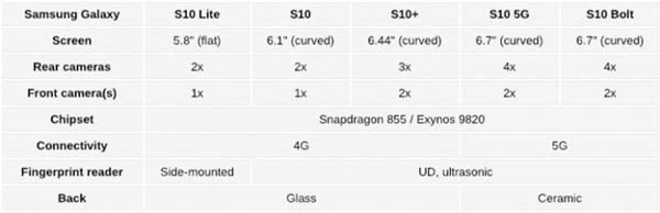 至于定位上,Galaxy S10 Lite是入門的,最高端的是Galaxy S10 Bolt,除了屏幕尺寸不同外,這些新機(jī)在前、后攝像頭、指紋識(shí)別上也不相同,具體來說如下: