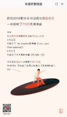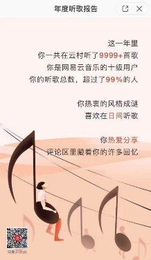 2019年1月4日,網(wǎng)易云音樂(lè)推出2018年度聽(tīng)歌報(bào)告,通過(guò)回顧過(guò)去一年聽(tīng)歌“足跡”展現(xiàn)音樂(lè)對(duì)每個(gè)人生活的陪伴,一上線(xiàn)就已經(jīng)刷屏朋友圈。