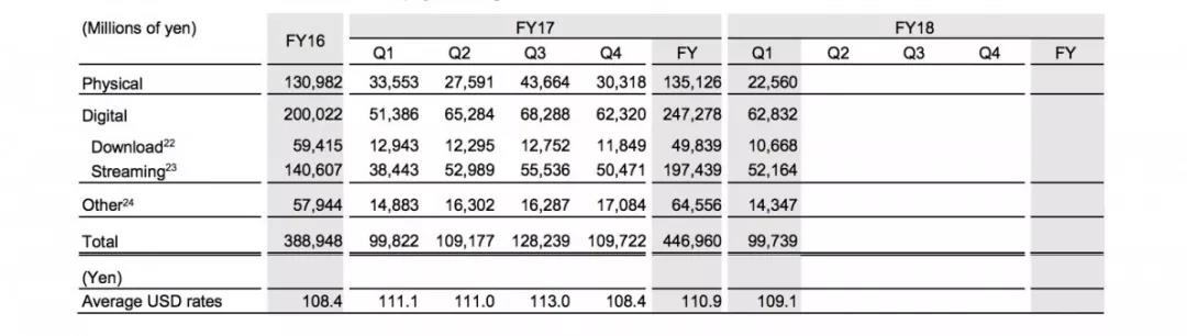 從財(cái)報(bào)數(shù)據(jù)來(lái)看,在2016年,索尼音樂(lè)的流媒體收入就已經(jīng)超過(guò)了實(shí)體收入。而在2017年,二者差異更加明顯。2017年實(shí)體收入僅上漲了4億日元,而流媒體收入上漲了57億日元,漲幅高達(dá)40.4%。而2018年第一季度的數(shù)據(jù)顯示,實(shí)體收入相較于2017年第一季度下滑了33.6%,流媒體反而比2017年同期增長(zhǎng)了43.1%。