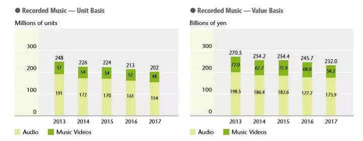 IFPI《2018全球音樂(lè)報(bào)告》顯示,在2017年,日本實(shí)體唱片的市場(chǎng)份額高達(dá)72%,是世界上實(shí)體唱片市場(chǎng)份額最高的國(guó)家。根據(jù)外媒MBW對(duì)日本唱片協(xié)會(huì)(Recording Industry Association of Japan)統(tǒng)計(jì)數(shù)據(jù)的分析,日本流媒體市場(chǎng)在2018年的前九個(gè)月與去年同期相比增長(zhǎng)了29%收入超過(guò)225.9億日元(約2億美元)。而同期CD的市場(chǎng)份額為1145.6億日元(10億美元),是前者的五倍之多。