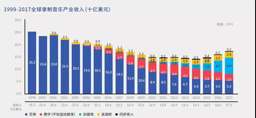 從全球角度來(lái)看,流媒體已經(jīng)勢(shì)不可擋,成為了產(chǎn)業(yè)增長(zhǎng)的主要驅(qū)動(dòng)因素。據(jù)IFPI數(shù)據(jù)顯示,從2013年的14億美元上漲到2017年的66億美元——五年之間,翻了五倍之多。