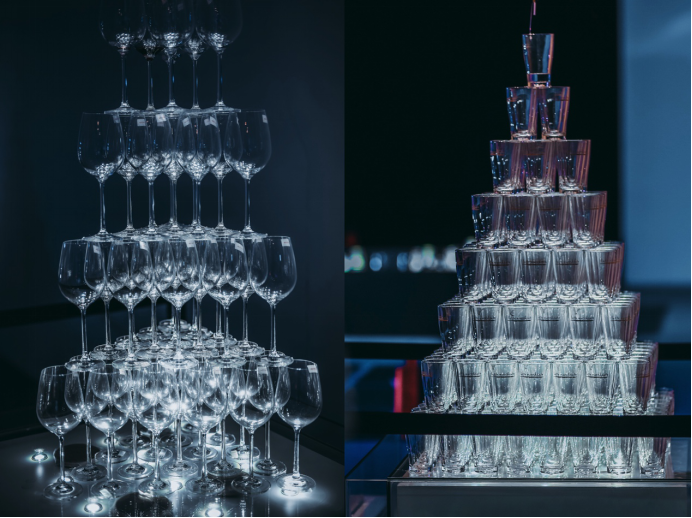 郭強(qiáng)用蒙太奇手法將高腳杯、香檳杯組成的“香檳塔”與紅酒、白酒等元素“剪輯”在一起的藝術(shù)裝置《無(wú)題》,制造出一種概念與時(shí)空交錯(cuò)的感覺(jué),能夠給你帶來(lái)視覺(jué)、嗅覺(jué)和味覺(jué)等感官不同的感受和體驗(yàn)。作品中的WMF德國(guó)福騰寶咖啡杯,使用水晶玻璃材質(zhì),耐熱抗造,整個(gè)杯身晶瑩剔透,通透光潔;青蘋(píng)果水晶玻璃紅酒杯,線(xiàn)型流暢,高挑輕盈,天生為品味而生。