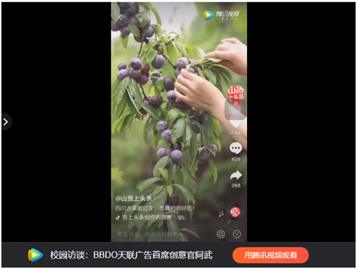第二個(gè)例子也很小。字節(jié)跳動(dòng)平臺(tái)有“山貨上頭條”這樣一個(gè)賬號(hào),核心就是幫助山里的村民賣水果或者農(nóng)產(chǎn)品。今年10月份,這個(gè)賬號(hào)用短視頻將新鮮水果如何從山上摘下來(lái)的過(guò)程展示出來(lái),形式也很簡(jiǎn)單,視頻下面帶一個(gè)購(gòu)物車鏈接,如果你看到并感興趣,可以直接點(diǎn)擊購(gòu)物車購(gòu)買。4條抖音,用了5天時(shí)間,后臺(tái)播放量是300多萬(wàn),并不高,但卻幫助了3800多個(gè)農(nóng)戶賣出了24萬(wàn)斤的李子。