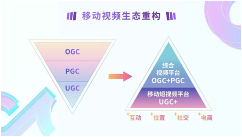 可以說(shuō),這個(gè)平臺(tái)既是文化傳播的陣地,又是內(nèi)容社交發(fā)聲地,又成了興趣轉(zhuǎn)化的陣地,所以UGC短視頻平臺(tái)在整個(gè)視頻行業(yè)里面已經(jīng)形成自己非常獨(dú)特的位置,金字塔結(jié)構(gòu)也產(chǎn)生了變化。我們看到,視頻數(shù)量、停留時(shí)長(zhǎng)、用戶關(guān)注度、話題討論度都在從OGC下沉到PUGC端視頻平臺(tái)。另外,UGC視頻平臺(tái)已經(jīng)形成了自己非常獨(dú)特的行為,用戶在上面、品牌主在上面,可以有非常多的、不一樣的玩法和空間。