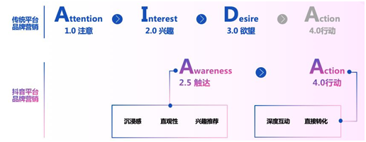 傳統(tǒng)我們都在說(shuō)AIDA,就是營(yíng)銷是四步,你要先做完第一步才能到第二步、第三步第四步,但因?yàn)橐曨l的更沉浸、更直觀,同時(shí)算法按照興趣的推薦,實(shí)際上在抖音很有可能一下子縮短到只有兩步,從真正看到到喜歡的過(guò)程可以很短,可以就只有15秒。