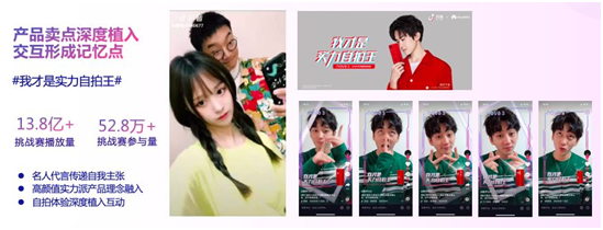 這是其中一個(gè)例子,這款華為新品的核心賣點(diǎn)就是自拍。過(guò)去大家推廣自拍會(huì)怎么做?就是找一個(gè)明星或者找一個(gè)紅人拍TVC廣告或者平面廣告?它跟抖音的結(jié)合也很巧妙,因?yàn)槎兑羰呛芏嗲榫跋掠脩粼谧耘牡膽?yīng)用,于是品牌在抖音上合作了話題活動(dòng)#我才是實(shí)力自拍王#。在抖音,你所吸引到的每一個(gè)年輕的、潛在的用戶或者說(shuō)消費(fèi)者,都可以成為你的品牌代言人,在你的加持下體驗(yàn)這種自拍的功能,引發(fā)了很多很有趣的線上視頻。