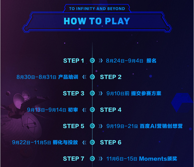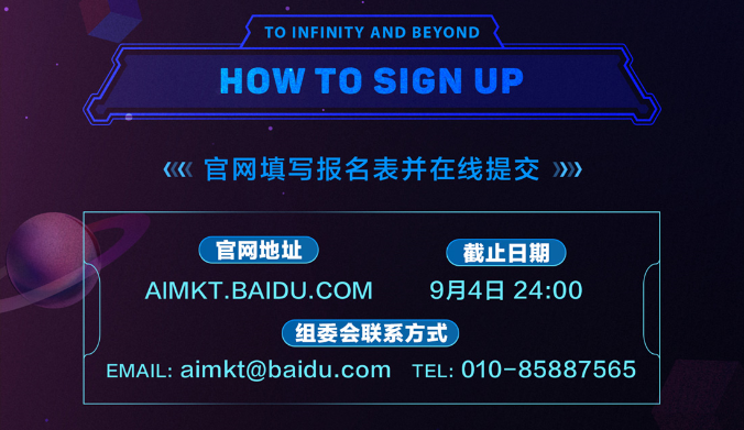 此次大賽采用定向邀約和公開招募兩種報名方式,營銷從業(yè)者&愛好者可以在官方網(wǎng)站(aimkt.baidu.com)填寫報名表并在線提交申請。其中8月24日-9月4日為報名時間,參賽者可在9月10日前提交參賽方案,9月13-14日進行作品初審,9月19-21日將舉辦百度AI營銷創(chuàng)想營,9月22日-11月5日對參賽作品進行孵化投放,最終在11月的百度商業(yè)盛典Moments上對獲獎?wù)哌M行頒獎。