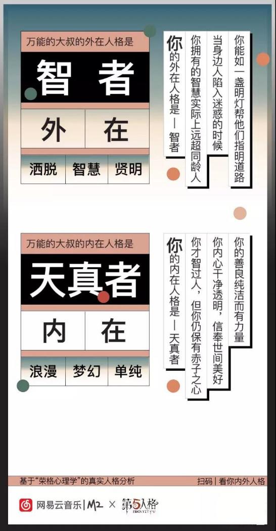 網(wǎng)易云音樂這次的“人格測試”H5的刷屏,大叔認為核心還是優(yōu)越感,比如大叔測試完,看到結(jié)果,挺開心的:大叔的外在人格是“智者”,內(nèi)在是“天真者”,哇,感覺好像一個很優(yōu)秀的人耶,感謝分享到朋友圈,告訴親朋好友們。