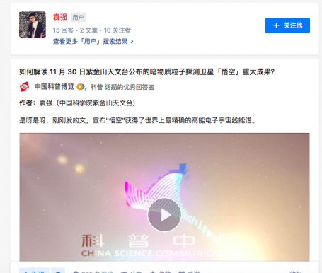 活動現(xiàn)場嘉賓黎耕、袁強(qiáng)等人,除了是天文研究員的身份以外,他們同時(shí)也作為知乎用戶在站內(nèi)分享著自己專業(yè)的知識、經(jīng)驗(yàn)、見解。作為2017年國內(nèi)乃至世界最受關(guān)注的天文界事件,《自然》雜志 11 月 29 日發(fā)表我國暗物質(zhì)粒子衛(wèi)星“悟空”的首個(gè)科學(xué)成果,宣布獲得了世界上最精確的高能電子宇宙線能譜。在知乎上,該事件同樣受到大量用戶的關(guān)注與討論,站內(nèi)機(jī)構(gòu)號“中國科普博覽”更是發(fā)起免費(fèi)Live解讀“悟空”暗物質(zhì)粒子的新發(fā)現(xiàn)——“如何解讀 11 月 30 日紫金山天文臺公布的暗物質(zhì)粒子探測衛(wèi)星「悟空」重大成果?”中國科學(xué)院紫金山天文臺研究院袁強(qiáng)就參與了討論回答,引來網(wǎng)友點(diǎn)贊。