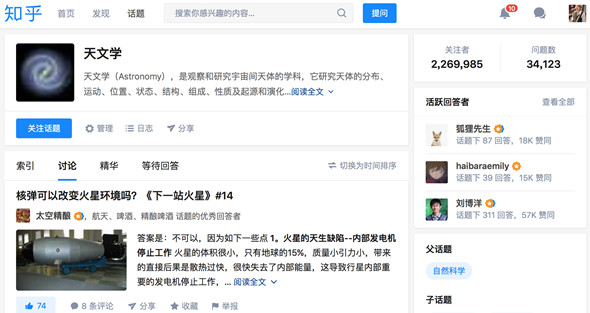 事實(shí)上,在知乎站內(nèi)“天文學(xué)”相關(guān)話題累計(jì)有超過220萬的關(guān)注用戶,問題數(shù)高達(dá)34123條,可以說知友對于宇宙星空的探索討論從未停止。同時(shí),截止到2018年5月,知乎注冊用戶達(dá)到1.6億,每天有數(shù)以千萬計(jì)的用戶在這里提出問題、發(fā)布回答、瀏覽話題。