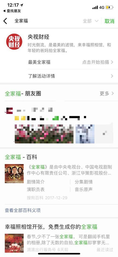 除此之外,微信搜一搜也強(qiáng)力助陣。在春節(jié)期間,用戶通過微信搜一搜“全家福”可直達(dá)“全家?!盚5活動卡片,直接參與活動,縮短了進(jìn)入路徑和門檻,方便活動查找,讓更多的用戶一起感受團(tuán)圓溫情。