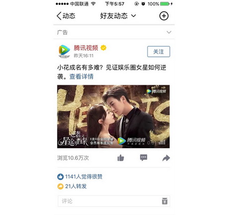 近期熱播的億萬流量大劇《逆襲之星途璀璨》、一周即獲千萬播放量的二次元喜劇《我女朋友的男朋友》,姍姍來遲的影視大作《無問西東》,均以原生信息流廣告形式,結(jié)合騰訊社交大數(shù)據(jù)的定向與人群挖掘能力,在上映前投放預(yù)告短片,試水這一全新觸達(dá)模式。