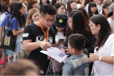 在距離比賽開始僅有一小時時,湖南國際會展中心的門口已是熱鬧非凡。門內(nèi)堆著高高的、擺放有序的神筆馬良VR眼鏡,門外排隊的粉絲人手一部手機(jī),忙著掃碼分享朋友圈,通過微信分享的方法來免費領(lǐng)取眼鏡,其火爆程度可見一斑。隨著粉絲入場人數(shù)的增多,不到一小時,VR眼鏡就已贈送完畢。