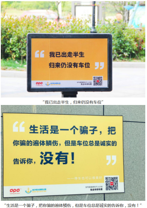 蜂擁而來的人,都在這些標語前停下了腳步,或是自嘲或是沉默。這個扎心的停車場,成功地吸引了這座城市的每一位車主,令每個人都對停車的不易而感同身受。