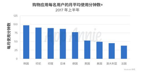 ??2017 年上半年,iOS 和 Google Play 中購(gòu)物應(yīng)用的全球下載量同比增長(zhǎng)了 20%,在所分析的國(guó)家中,Android 手機(jī)用戶平均每個(gè)月使用不同購(gòu)物應(yīng)用的最短時(shí)長(zhǎng)為 35 分鐘。