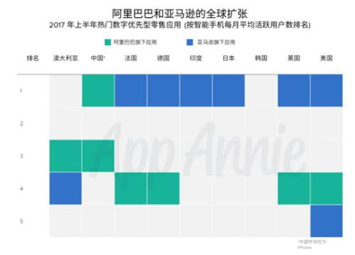 ??同樣,亞馬遜也在繼續(xù)擴(kuò)大其在全球的主導(dǎo)地位,在我們所分析的 9 個(gè)市場(chǎng)的 7 個(gè)市場(chǎng)中躋身前五名,甚至滲透到了印度和日本等東方市場(chǎng)。與阿里巴巴類似,與去年同期相比,亞馬遜在 2017 年上半年出現(xiàn)在了一個(gè)全新國(guó)家的數(shù)字優(yōu)先型應(yīng)用前五名榜單中,即澳大利亞。
