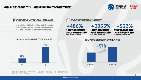 ??從消費(fèi)數(shù)據(jù)來看,女性依舊是消費(fèi)主要群體。同時,男性群體對于美妝的興趣開始提升。線上男性消費(fèi)者踴躍加入愛美大軍,社交平臺同時提及男士和美妝相關(guān)聲量大增57%。2019年618期間,6月1日前1小時京東男士爽膚水銷售額同比增長超過2355%。