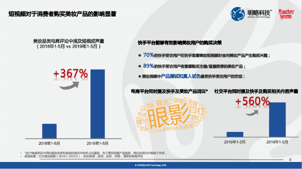 ??相對2018年1-5月與2019年1-5月期間,電商平臺同時提及快手及美妝產(chǎn)品詞云,社交平臺同時提及快手及購買相關(guān)內(nèi)容聲量大增560%。