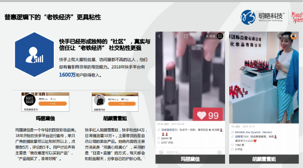 ??報(bào)告最后指出,普惠邏輯下的“老鐵經(jīng)濟(jì)”更具粘性,快手開放平臺思維賦能商品銷售,這些都讓快手平臺的美妝營銷潛力巨大。快手上有大量粉絲量、訪問量不高的達(dá)人,也有著非同尋常的帶貨能力。2018年,快手平臺有1600萬用戶獲得收入。去中心化算法,以及普惠價值觀下的真實(shí)用戶+內(nèi)容生態(tài),讓快手商業(yè)顯示出強(qiáng)大的增長動能。