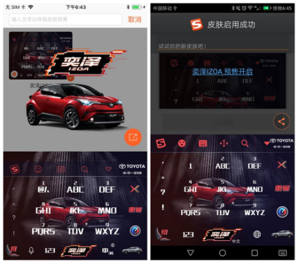 搜狗還為一汽豐田奕澤IZOA打造了專屬的輸入法皮膚,不僅在視覺上與一汽豐田奕澤IZOA進(jìn)行了呼應(yīng),還提供了全鍵盤及九宮格兩種形式,細(xì)致、周全的貼合用戶使用習(xí)慣。同時(shí),用戶點(diǎn)擊相應(yīng)的功能鍵,還將有浮層的展現(xiàn)形式,進(jìn)一步加深用戶的記憶度并更直接地關(guān)聯(lián)到品牌信息。