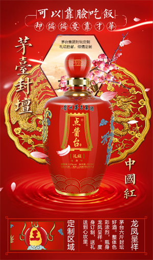 這次眾籌的大壇定制酒是正宗茅臺集團“點醬臺”的六斤壇,分為“中國紅”和“帝王黃”兩種釉色,兩壇均采用正宗景德鎮(zhèn)上等國瓷精品,分別配以“雙龍戲珠”、和“龍鳳呈祥”的傳統(tǒng)圖案,其中“如日中天”的紅色浮雕巧妙地安排為消費者個性定制區(qū)域,消費者不但可以選擇不同的顏色和圖案,同時可以將個人或贈送對象的名字以定制方式永久的鐫刻在壇身的“紅日”浮雕上,成為獨具個性及永久紀念意義的禮藏品。