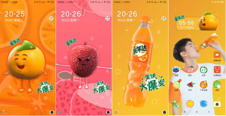 同時,在手機(jī)不離身的當(dāng)下,手機(jī)端同樣是不容忽視的重要點(diǎn)位,不同于投放開屏廣告、Banner點(diǎn)位等傳統(tǒng)營銷方式品牌年輕化創(chuàng)新營銷的內(nèi)核是賦予品牌以生命力,不是一味地生硬迎合最新的趨勢,而是通過將品牌、產(chǎn)品有機(jī)的結(jié)合,進(jìn)行系統(tǒng)性的再造。此次美年達(dá)×小米合作創(chuàng)新的選擇了定制主題這種形式,巧妙地通過將解鎖與“果味大爆發(fā)”兩者概念做了巧妙的融合,不僅完美詮釋了美年達(dá)跟年輕人玩在一起的品牌理念,而且每一次解鎖都是一次“果味爆發(fā)”的直觀體驗(yàn)。為了強(qiáng)化多果味、全新瓶型再到代言人劉昊然的品牌資產(chǎn),此次合作中利用一套主題四種解鎖特效的形式進(jìn)行展示,特別是劉昊然主題畫面,更是滿足了粉絲與愛豆親密接觸的心理,深受米粉好評。而用戶的每次開啟手機(jī)都是一次對于美年達(dá)品牌資產(chǎn)與產(chǎn)品特性的印象的加深,從而在潛移默化中占領(lǐng)用戶心智。
