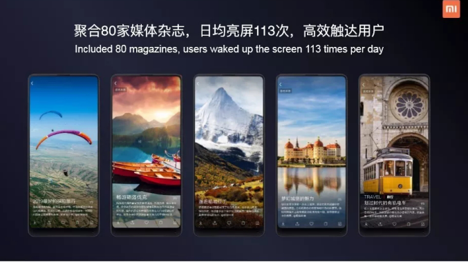 例如手機(jī)畫報,被稱為“米粉忠愛的手機(jī)端旅游雜志,開屏第一眼入口媒體”。不僅有利展示旅游景地等素材,聚合80家媒體雜志的優(yōu)質(zhì)內(nèi)容,以及日均亮屏113次,更可以與用戶建立長效的、內(nèi)在的聯(lián)系。