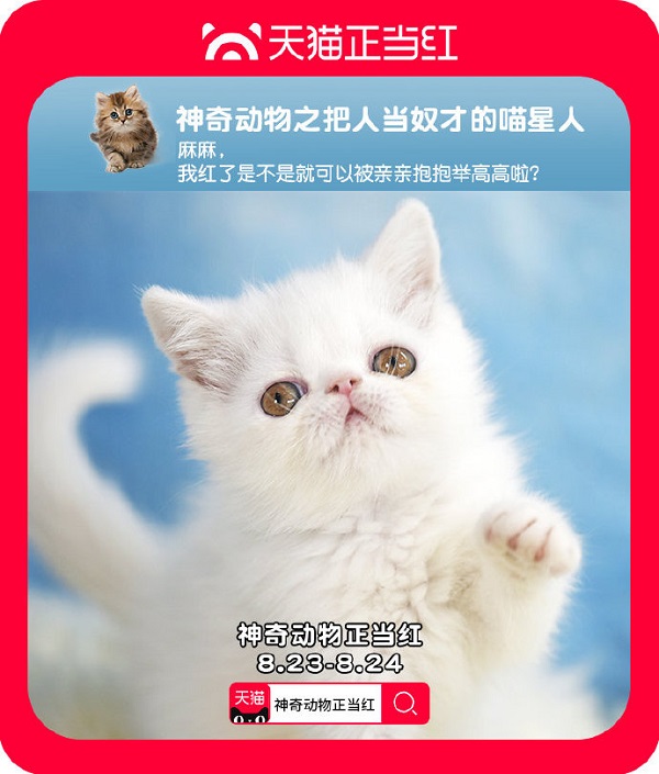 瞄準(zhǔn)這一趨勢(shì),8月23—24日,天貓跨品類熱點(diǎn)營銷IP——“天貓正當(dāng)紅”開啟了其8月“神奇動(dòng)物正當(dāng)紅”的主題campaign。天貓寵物行業(yè)首開小香豬、蜜袋鼯、蜘蛛、龜?shù)?0個(gè)網(wǎng)紅神奇動(dòng)物活體新品類,帶來了一場(chǎng)神奇動(dòng)物大賞。線下神奇動(dòng)物還“做客”了第22屆亞洲寵物展,給眾多寵物愛好者提供了直接接觸小眾寵物的機(jī)會(huì)。現(xiàn)如今天貓開辟了寵物線上購買新渠道,同時(shí)“神奇動(dòng)物正當(dāng)紅”整合了寵物主糧、寵物零食、美容清潔用品等15個(gè)相關(guān)品類,助力消費(fèi)者實(shí)現(xiàn)一站式消費(fèi)。