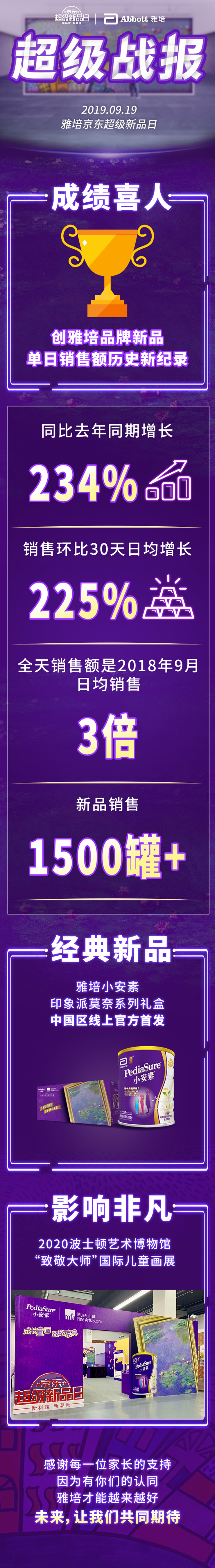 通過(guò)對(duì)經(jīng)典色彩畫作的致敬,展現(xiàn)了雅培陪伴寶寶多彩成長(zhǎng)的決心,也為父母描繪出一幅幅寶寶成長(zhǎng)的童真畫面。這樣的品牌理念深受認(rèn)可,也讓雅培在本次京東超級(jí)新品日中取得了十分優(yōu)異的成績(jī)。