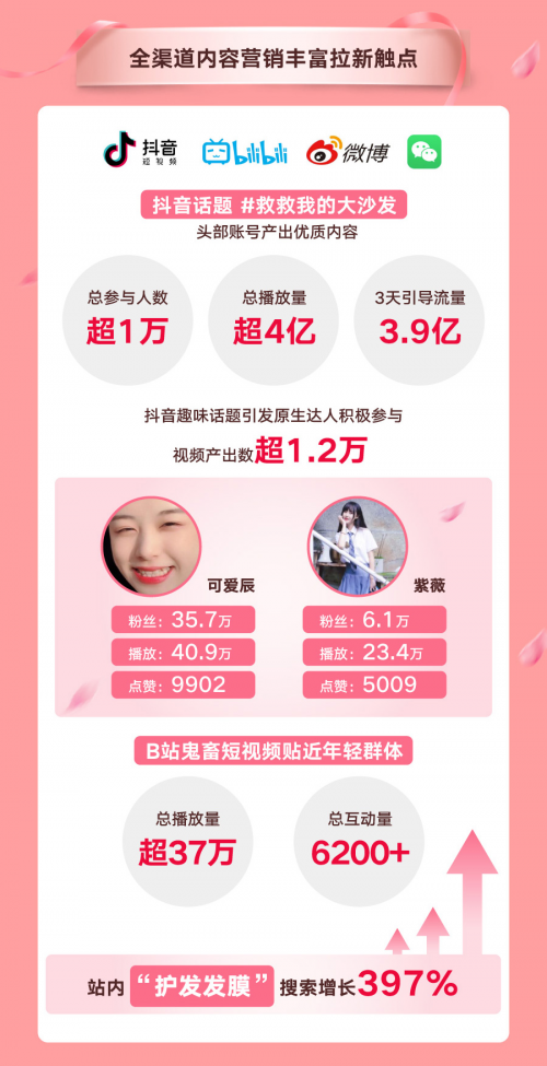 此次天貓品牌新享日亦通過全渠道的內(nèi)容合作賦能美護(hù)品牌的新客拓展。如在短視頻領(lǐng)域,借助前期《天貓洗護(hù)發(fā)行業(yè)消費(fèi)趨勢洞察》對(duì)消費(fèi)者進(jìn)行趨勢宣導(dǎo)的影響,結(jié)合抖音及B站兩個(gè)平臺(tái)實(shí)現(xiàn)站外的內(nèi)容擴(kuò)散和流量引導(dǎo),并通過短視頻的形式直觀教育用戶、提升流量及探索人群,再以微博和微信的內(nèi)容深化概念,最終以直播的方式促進(jìn)銷售轉(zhuǎn)化。