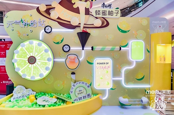 作為重中之重的線下布局,美圖將聯(lián)動(dòng)的兩個(gè)品牌重磅落在了「女性顏究所」的定制主題場(chǎng)館上。除美圖主場(chǎng)館之外,“玩美星球”分為愛(ài)情、親情、友情、財(cái)富和健康五大子場(chǎng)館,圍繞女性群體的不同身心需求展開(kāi),引發(fā)共鳴,為她們加油打氣。愛(ài)情館為丸美定制,被其詮釋為【愛(ài)情充電站】。健康館則由康師傅蜂蜜柚子包攬,將其打造為【元?dú)庋a(bǔ)給站】。